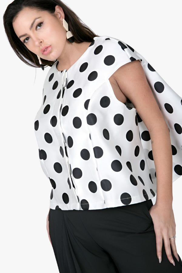 Add our Cascade Ruffle Detail Polka Dot Print Top in White/Black to your cart now and embrace both style and charm in one chic piece!