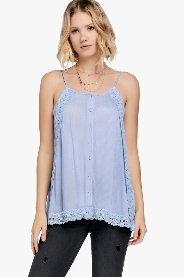 Boho Scallop Lace Trim Detailed Button Down Solid Subtle Textured Slit Side Overlay Layered Cami Top