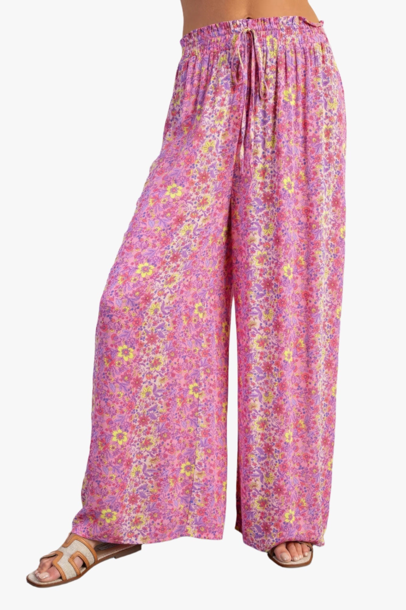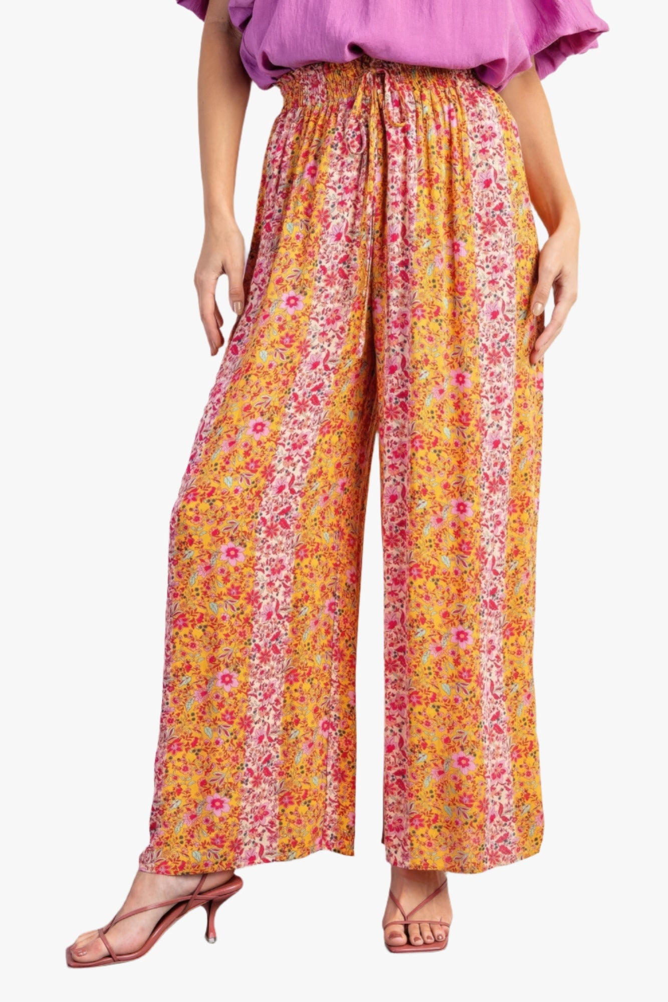 Experience the perfect blend of comfort and floral elegance. The smocked waistband, adjustable front tie, and wide-leg fit make these pants a versatile choice for various occasions.