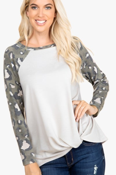 Introducing our "Casual Chic" French Terry Side Twist Top, proudly made in the U.S.A. This top effortlessly combines casual comfort with a touch of sophistication, featuring a French Terry fabric with a stylish twist—animal print long sleeves in a versatile Oat color.