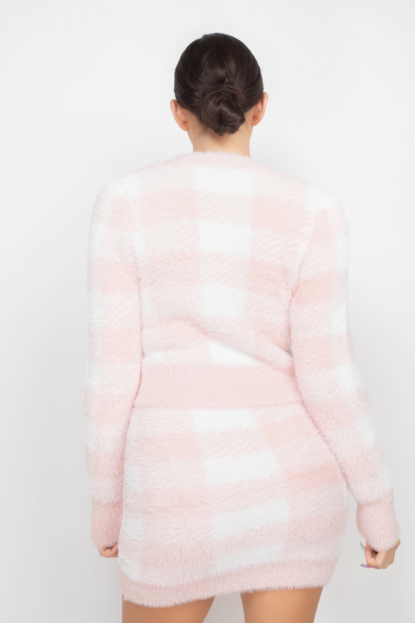 Elevate your winter wardrobe with our Cozy Chic Plaid Cardigan—a must-have for chilly days. This fuzzy knit cardigan boasts a charming plaid pattern that adds a touch of warmth and style to your ensemble. The button-front closure allows for easy wear, while the long sleeves and v neckline provide a classic and comfortable fit. The cropped hem adds a modern twist, making it the perfect addition to your fashion repertoire.