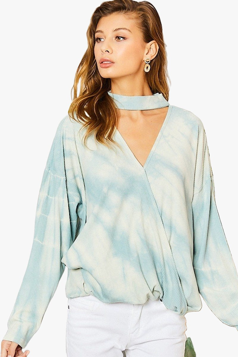 Add our Choker Neck Surplice Hi-Lo Tie-Dye Top in Blue Surf to your cart now and experience the perfect blend of fashion and comfort!