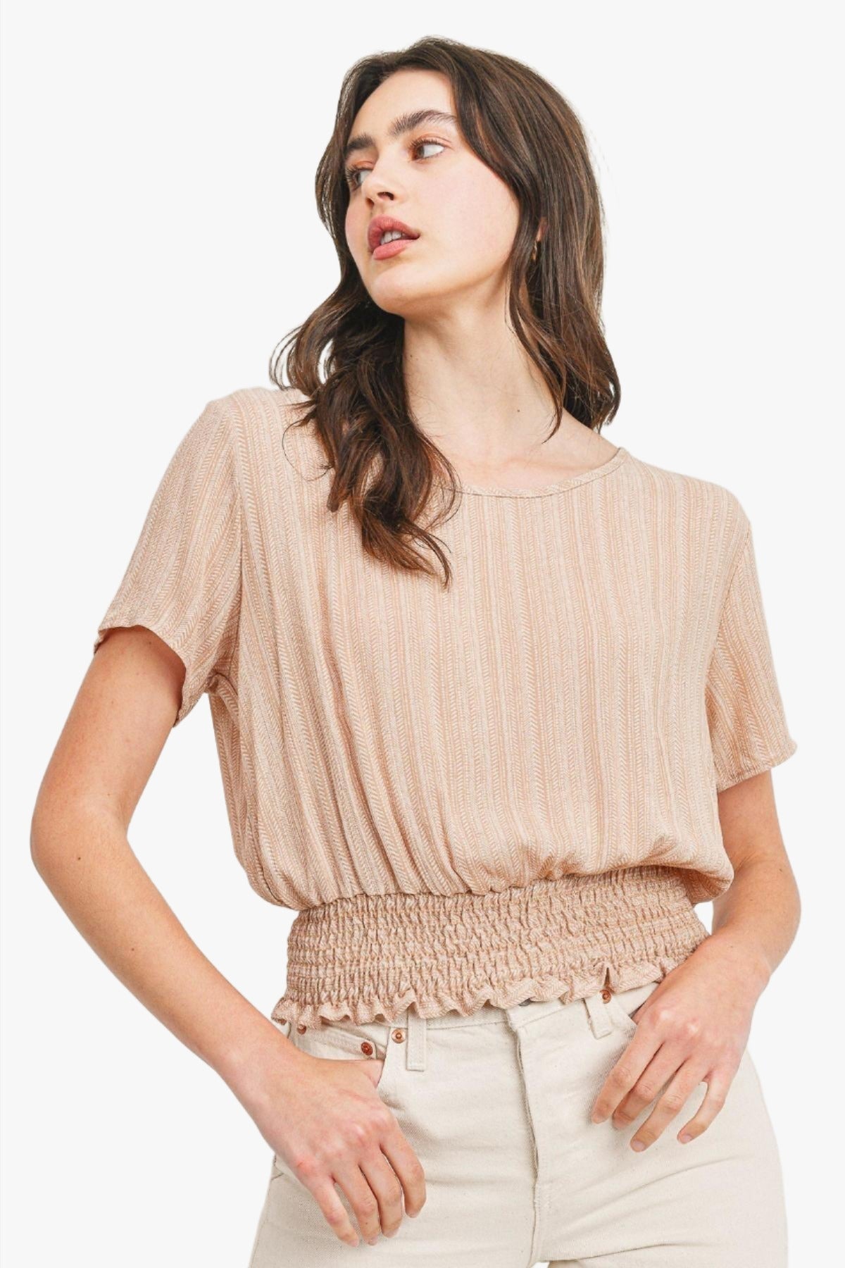 This top stands out with its unique crinkle gauze fabric, trendy smocked waist, and versatile Taupe Ivory color. It's the perfect blend of comfort and style, making it a must-have for your wardrobe.