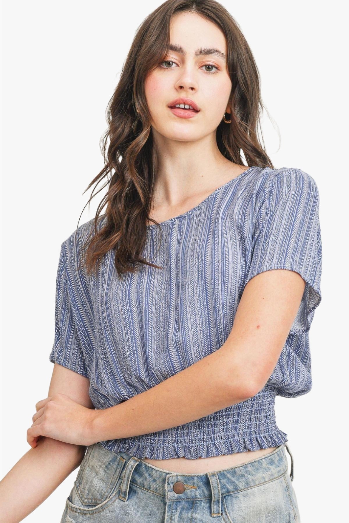 Woven Printed Crinkle Gauze Waist Smocking Short Sleeve Top