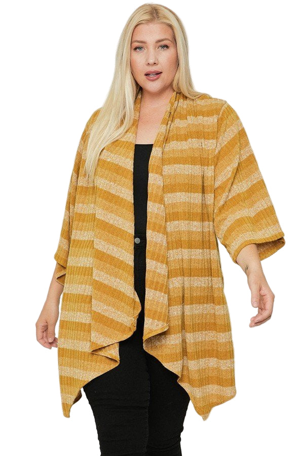 Striped cardigan featuring kimono style sleeves and an asymmetrical hem.