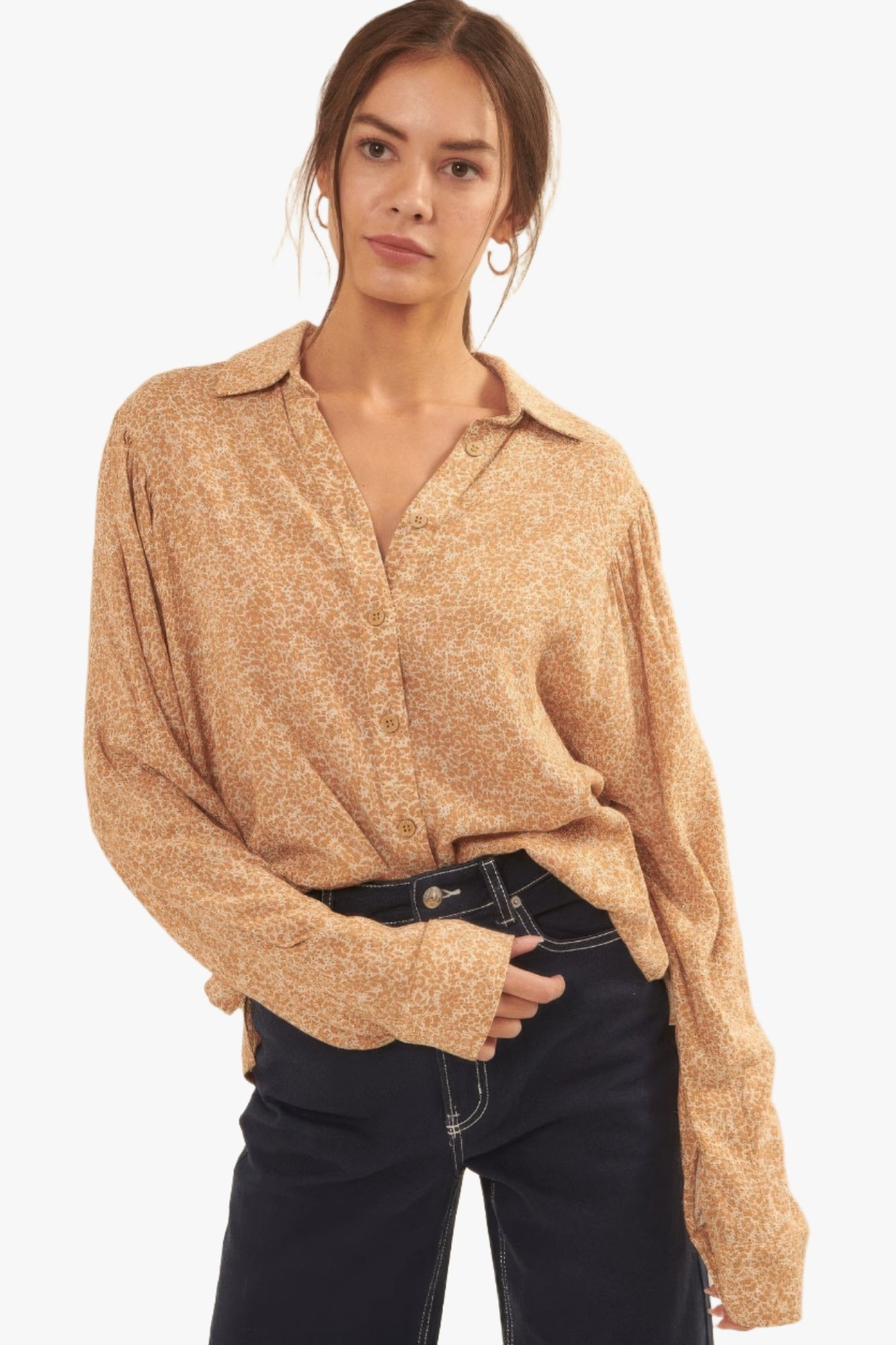 Add the Collared Neckline Floral-Print Shirt in "Caramel" to your cart now and embrace the perfect fusion of comfort and timeless style!