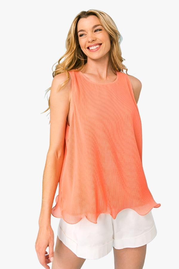 "I adore the Baby Pleated Sleeveless Top! The coral color is so vibrant, and the baby pleats add a lovely touch. Perfect for summer outings!" - Jessica W.