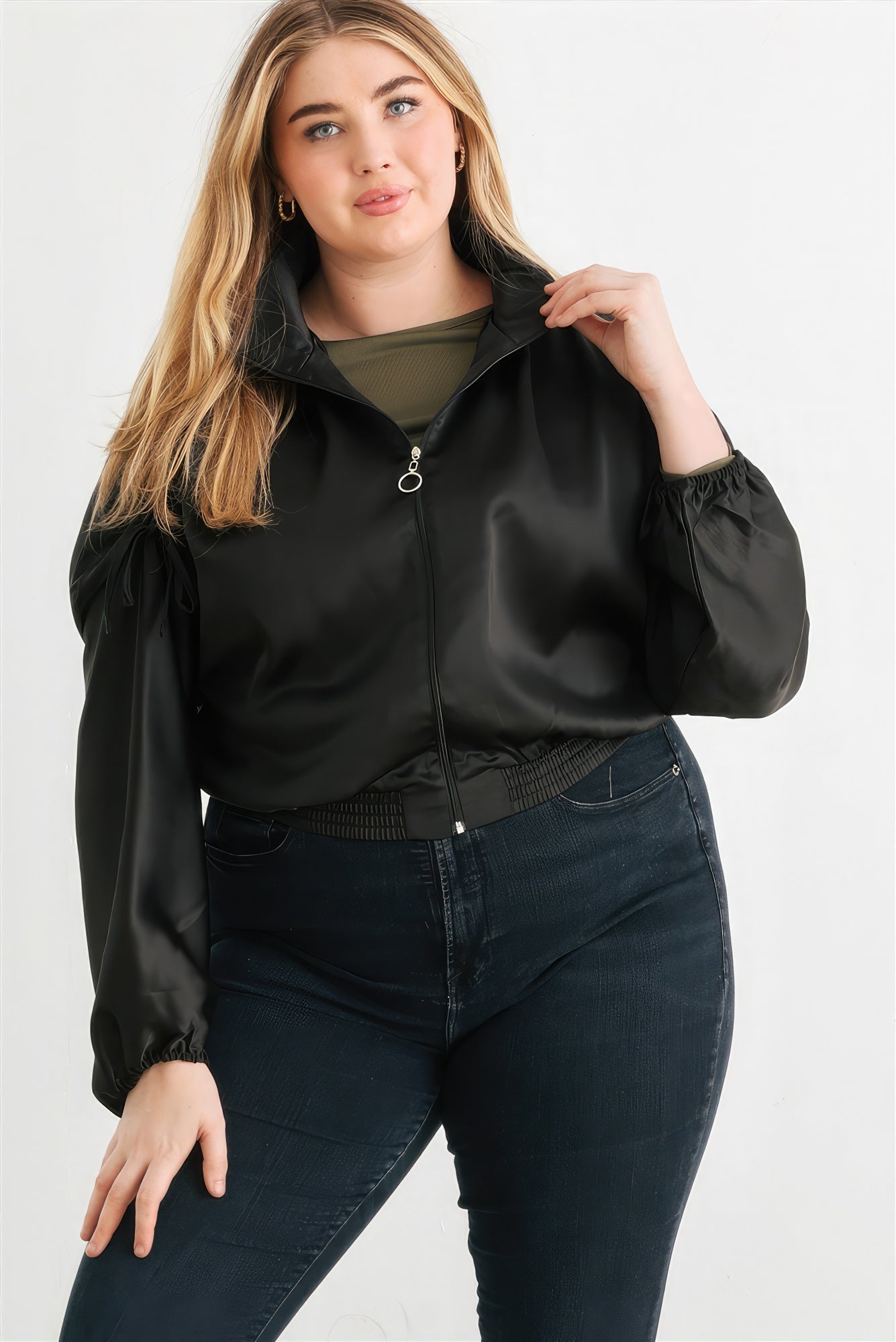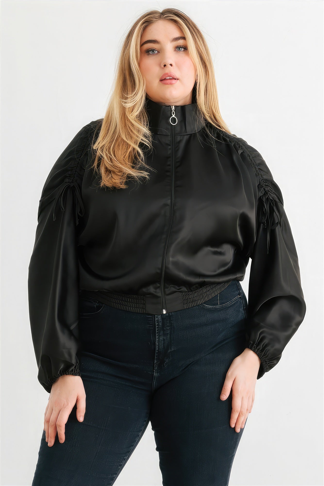 Elevate your style with our Plus Satin Zip-up Ruched Long Sleeve Cropped Bomber Jacket in the timeless Black hue. Add it to your cart now for the perfect blend of fashion and comfort!