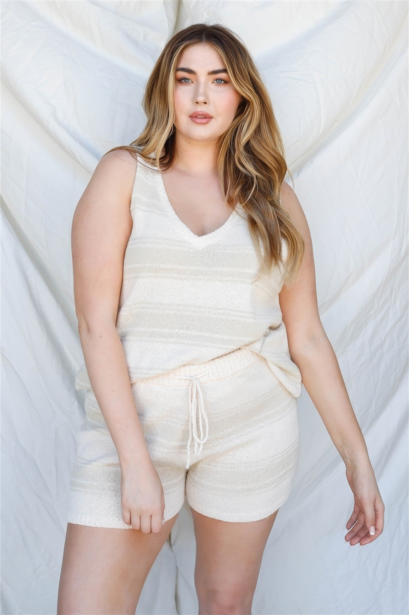 Transform your summer wardrobe with the Plus Stripe Knit Sleeveless Top & Short Set in White. Add it to your cart now and embrace the perfect blend of fashion and comfort!