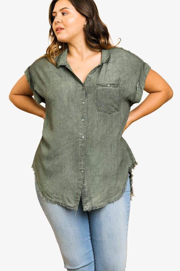 Elevate your casual style with our Washed Button-Up Short Sleeve Top with Frayed Hemline in Army. Add it to your cart now and experience the perfect blend of fashion and comfort!