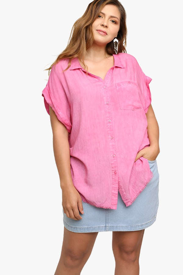 Washed Button Up Short Sleeve Top With Frayed Hemline
